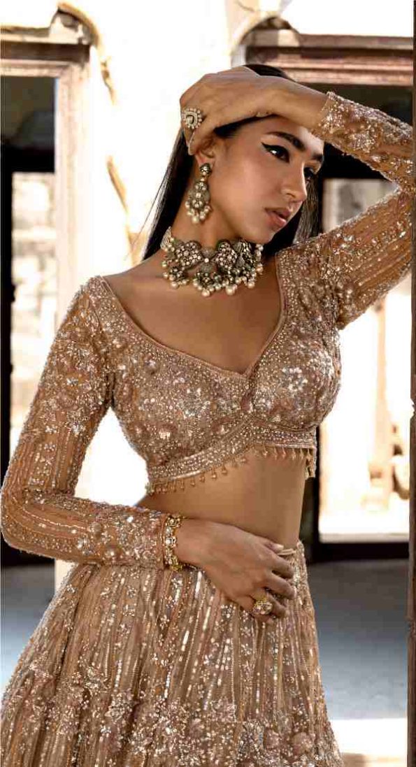 Done up on light weight soft organza this pale peach lehenga is embellished with very intricate hand sequins and dash of mirror embroidery and teamed up with a stylish choli and dupatta in net fabric.